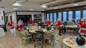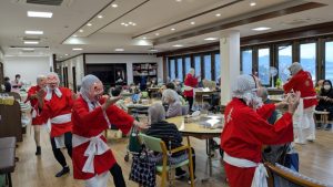 新着情報 2025年11月18日(火) ボランティアの方に来ていただきました 利用者様に楽しい時間を過ごしてもらおうとボランティアの方に来ていただきました。 皆様余り見ることのない『ひょっとこ踊り』のグループの方です。 初めて見る利用者様も多く席の周りを踊りながら回って下さり、笑顔や手拍子が出ていました。 今後もボランティアの方を招き、皆様に楽しい時間を過ごしてもらえるよう計画しています。 見学・体験で日程調整も可能です。是非来てみてください。 カテゴリ:未分類 « トピックスTOP »