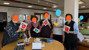 もらう作業で作品が完成した時は「出来た」と笑顔で記念撮影です